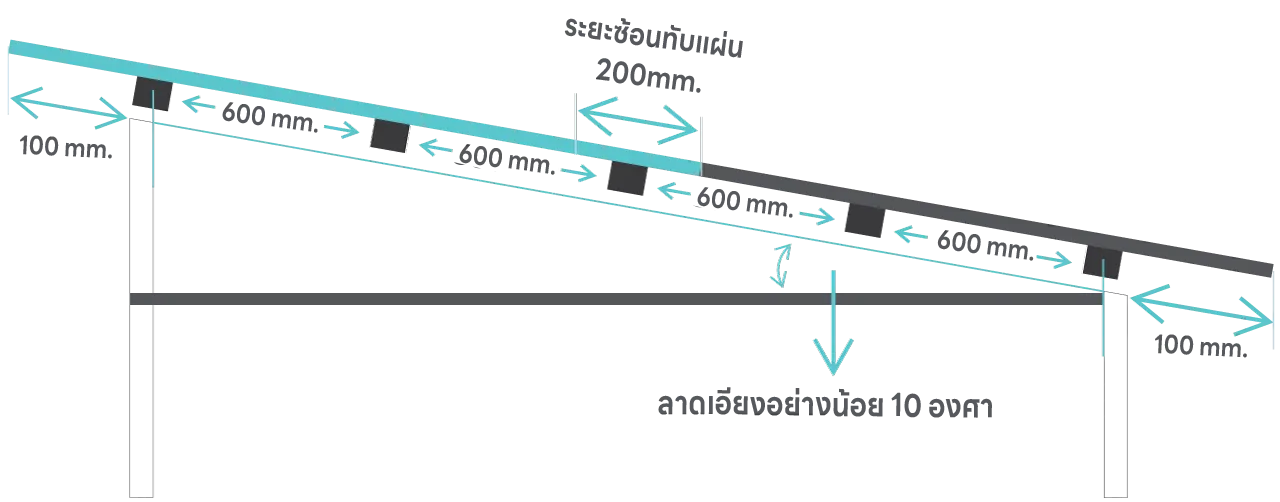 ควรซ้อนทับแผ่นไม่น้อยกว่า 20mm. แผ่นยื่นออกจากแปตัวสุดท้ายไม่มากกว่า 100mm. และระยะห่างแปไม่เกินกว่า 600mm.